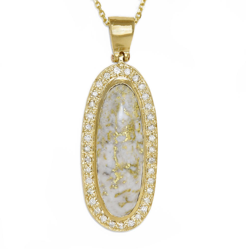 The stone in this pendant is gold quartz, one of the rarest forms of gold found on the planet. You can customize the gold type and color for the bezel and bail. A row of diamonds on the bezel surrounds the center stone.