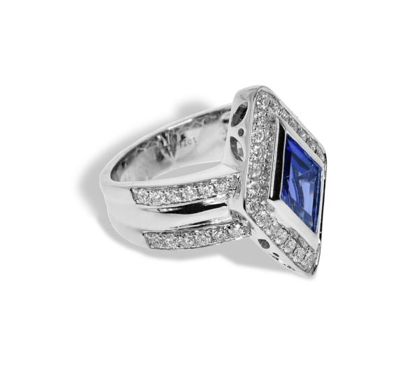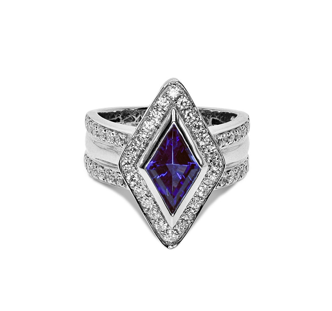 This stunning ring features rows of diamonds and a large lozenge cut Tanzanite stone. You get .82 ct weight of diamonds and a 2.92 ct weight Tanzanite stone. Customize with your choice of gold and gold color.