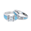 This gold ring features a 1 ct weight SI3 H color Princess Cut Diamond and Sleeping Beauty Turquoise inlay. Customize with your choice of gold type and color. This is the large ring only of a set of flush fit rings.